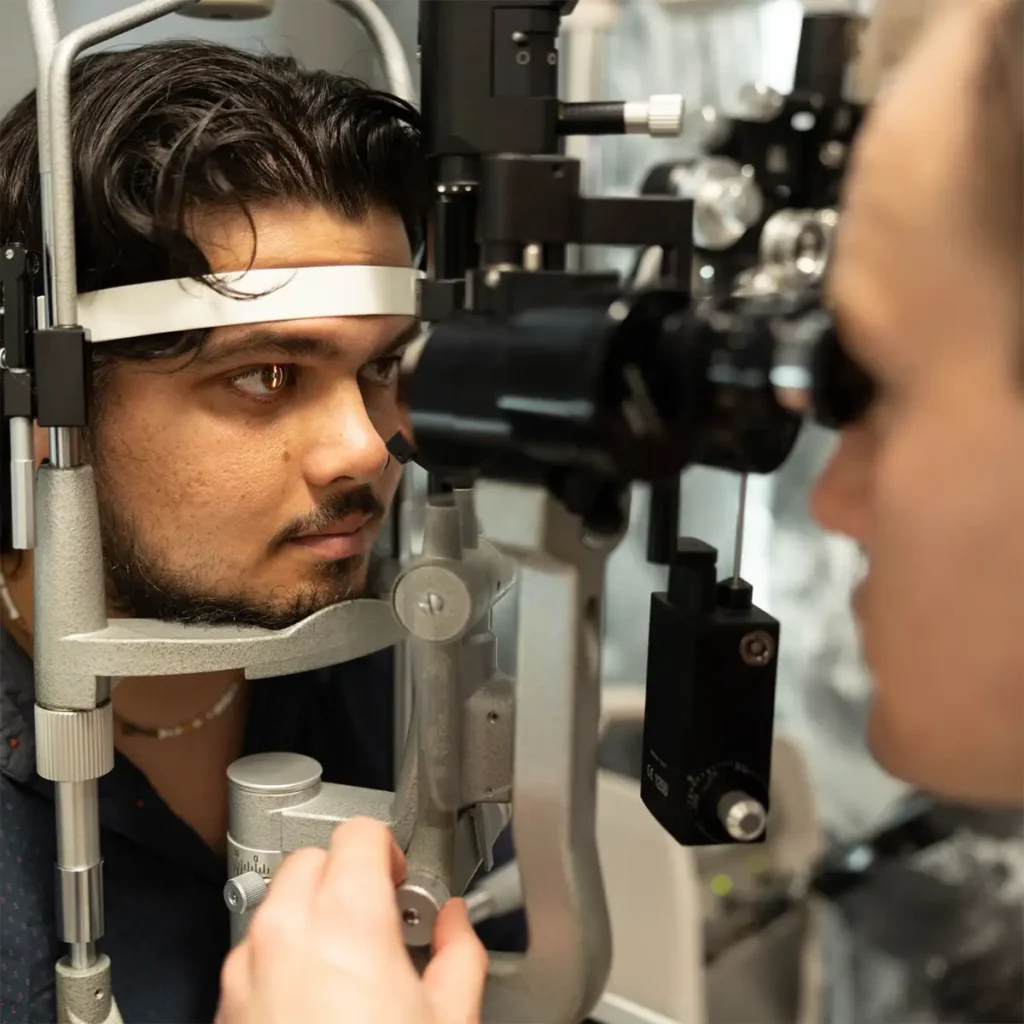 - Slit Lamp Exam: A Modern Vision Centers doctor will use a high-powered microscope to examine the structures of your eye in detail. This HD view allows the doctor to screen for conditions that affect the front, middle, and back of the eye – like pinkeye, allergies, diabetes, glaucoma, and macular degeneration.